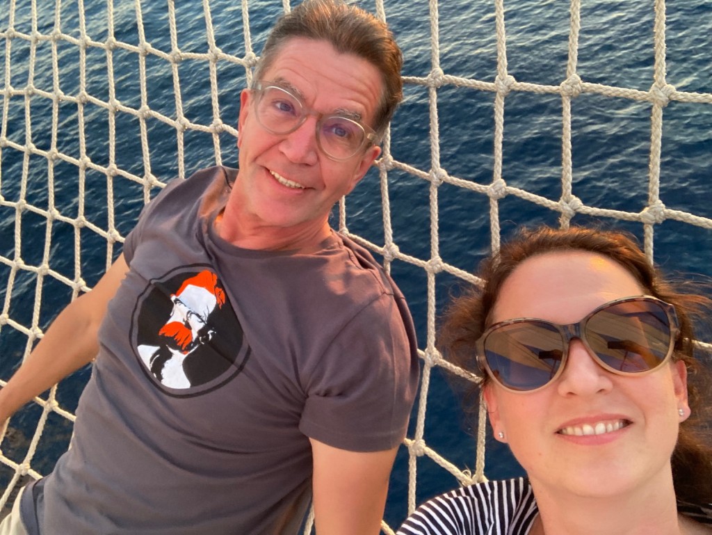 Apropos jung und hübsch: zu Stars der Reise wurden drei junge Schweden – Caroline, Louise und Phillip – die gerade ihren High-School-Abschluss hinter sich hatten und nun bis zum geplanten Studium für ein paar Monate auf der Star Clipper anheuerten, offiziell als »Sports Team«, tatsächlich aber gut gelaunt und für alles zuständig waren: Morgens gab es Yoga mit ihnen, später waren sie behilflich beim – aus meiner Sicht schwindelerregenden – Mastklettern, abends dann konnten wir sie bei der Modenschau bewundern oder beim Piratenspiel. Ja, solche Animationsveranstaltungen wie ich sie mir auf der Aida & Co. als den ausgemachten Horror vorstelle, gibt es tatsächlich auf der Star Clipper auch. Wahrscheinlich haben die Cruise Manager Sorge, die Gäste könnten zu wenig mit sich selbst anfangen und würden sich langweilen. Die drei Schweden vollbrachten das Kunststück, dass dieser Firlefanz bei uns (fast) nie zum Fremdschämen führte. Insbesondere Philipp, ein Junge mit dem Schmelz von Tadzio aus dem Tod in Venedig, vermochte alle Peinlichkeitsschwellen spielerisch-verführerisch zu umschiffen.